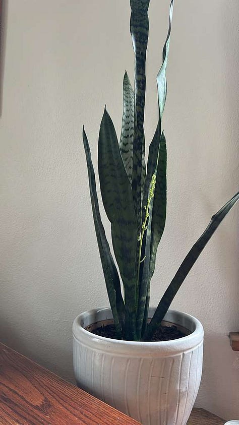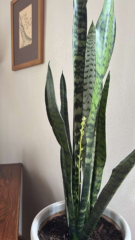 When she said her snake plant was flowering, I immediately thought, “It’s the Year of the Snake. Year 9. Death and rebirth.”
