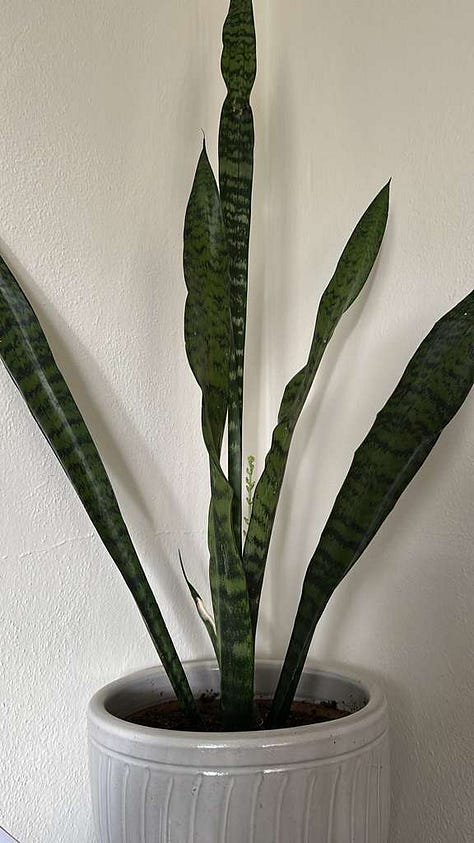 I also love the contrast of the snake plant vs its little flowering stalk. Snake plants have such a masculine, stoic and rigid energy. They’re protective, reserved and a bit closed…But here was this soft, lighter, less-rigid flower coming through. The feminine balance to the masculine structure.